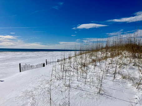 Wednesday morning revealed a sight we have never seen before, although one year there was a dusting of snow and in 2022 there was an ice storm.  I measured somewhere between three and five inches when I went out to investigate, but some drifts were knee-high.  And I have high knees.  What a beautiful sight!  Snow on the sand dunes, snow on the beach.  And today, as I complete this blog update, it is Thursday afternoon and not much of it has melted.  I have not run a step since Monday.  How am I supposed to train for a race?