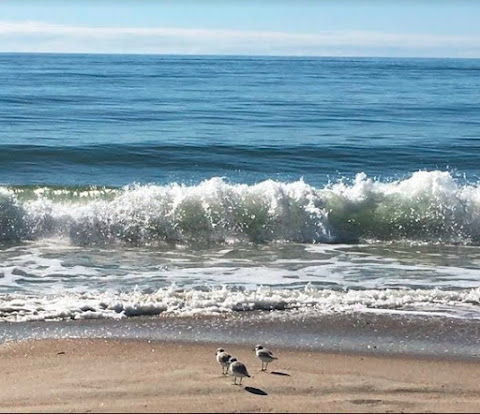 I was relieved to return to the condo. It had warmed up, and I downed a full bottle of Gatorade. Martha had left a note saying she was walking on the beach, so I went out to the dune-top deck to wait for her, enjoying simply sitting in the sun. A man and his wife squeaked by in a four-wheel wagon sort of vehicle containing folding chairs and what looked like eight or ten different fishing poles, out for the entire day on the beach, I guessed. Martha's slim figure appeared walking toward me and she waved. She had walked to the Oceanana Fishing Pier toward the west and taken some good photos which she shared with me. This little group of sanderlings looking for breakfast in the surf: