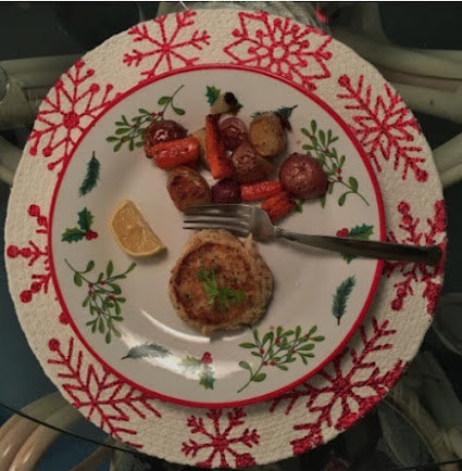 Now I sit at the table posting to this blog, having gone to Blue Ocean, our local seafood market, for our dinner tonight – crabcakes, prepared here by Martha, with a medley of roasted onions, potatoes, and carrots - and very likely the same crabcakes that Amos Mosquito will be serving tonight, at one-fourth the cost and in a reasonably-sized portion.